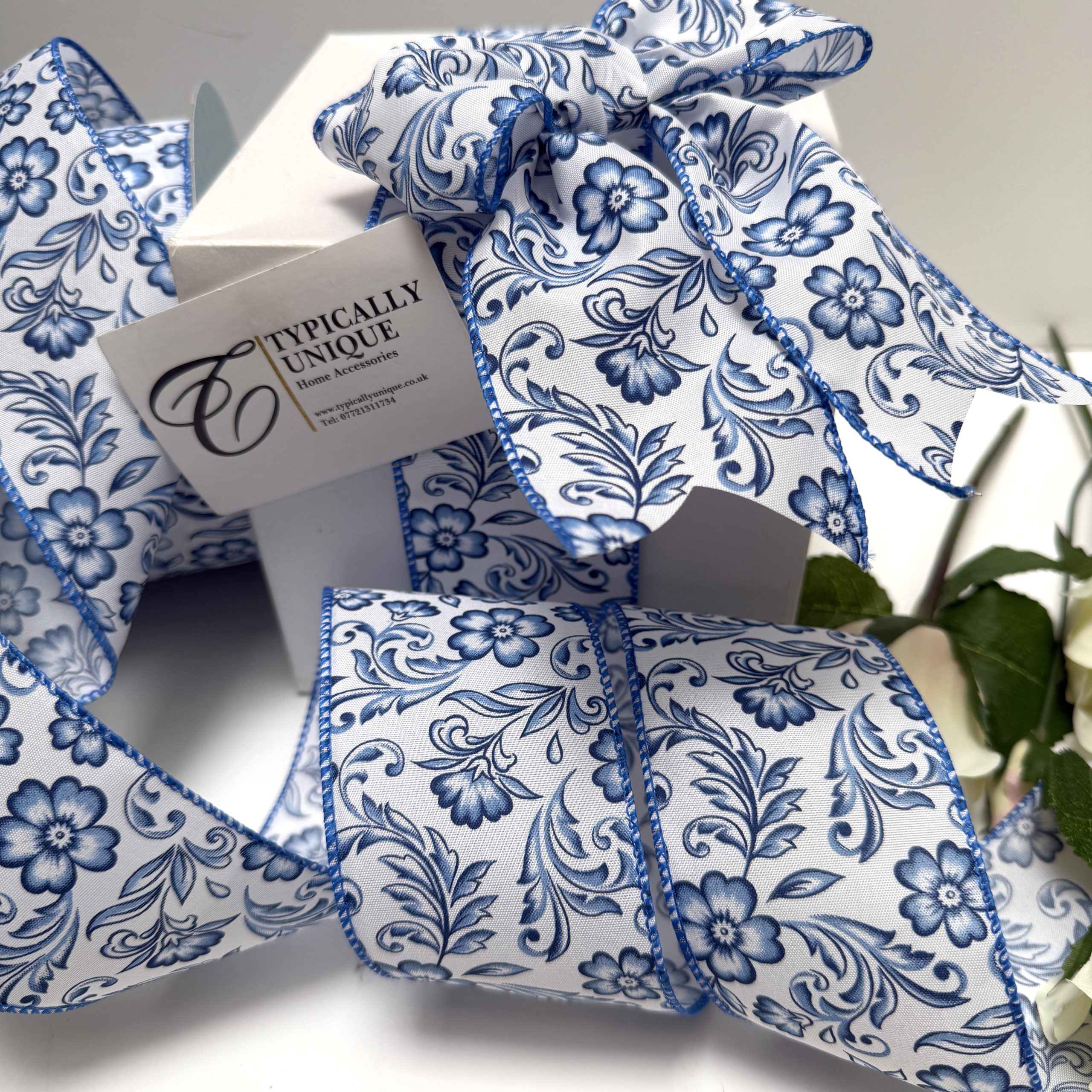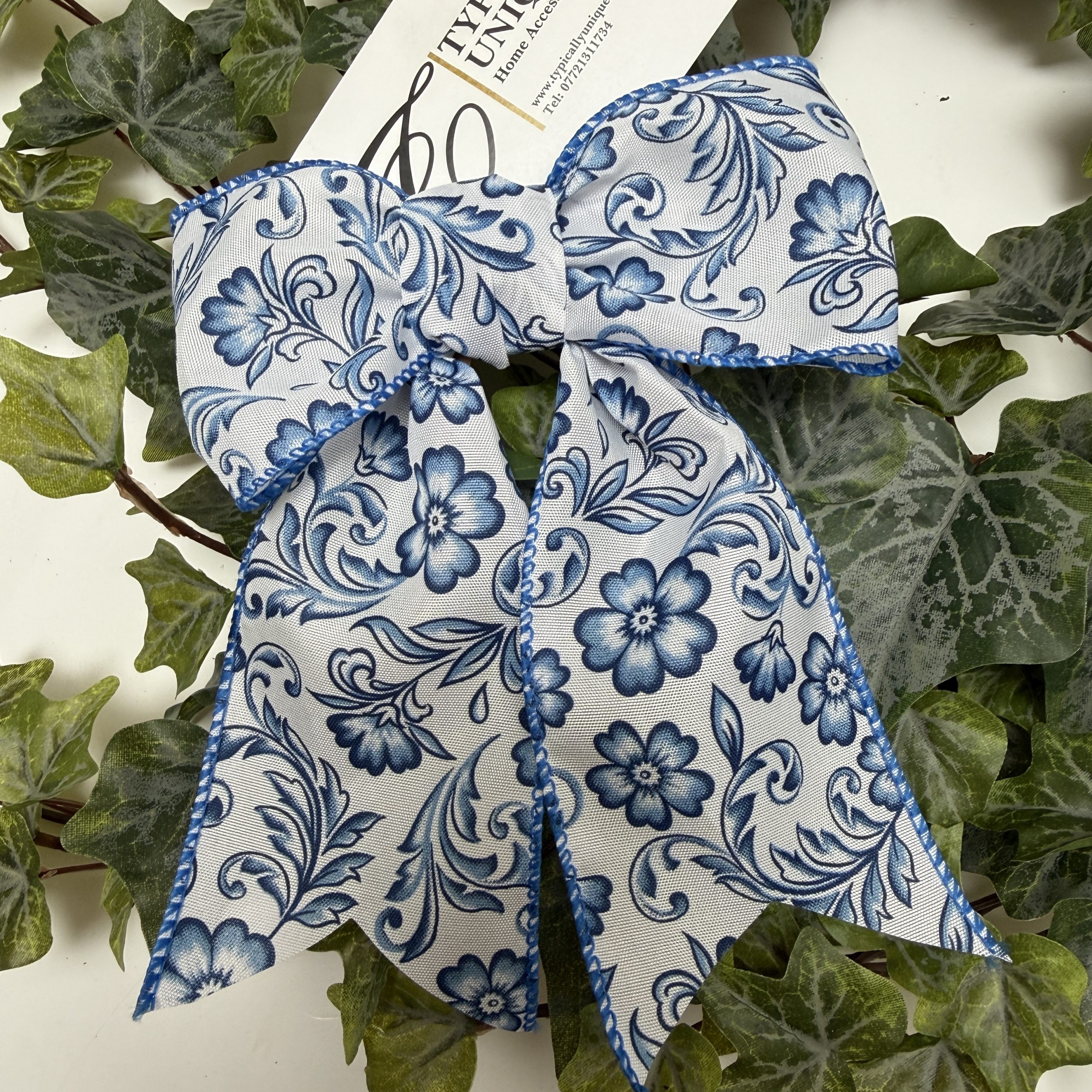 2 Pre-tied Wire Edged Blue and White Floral Bows ‘Bonnie’