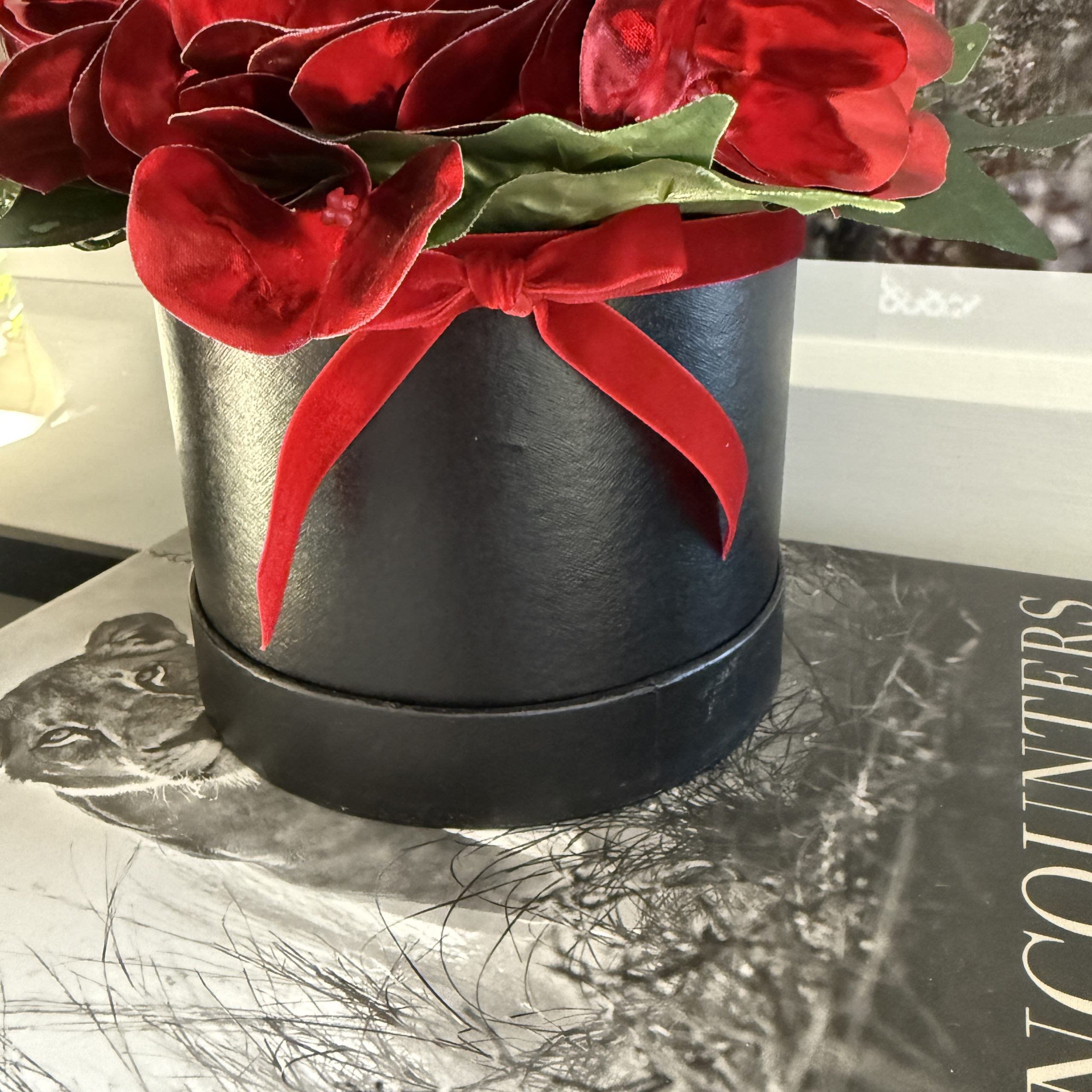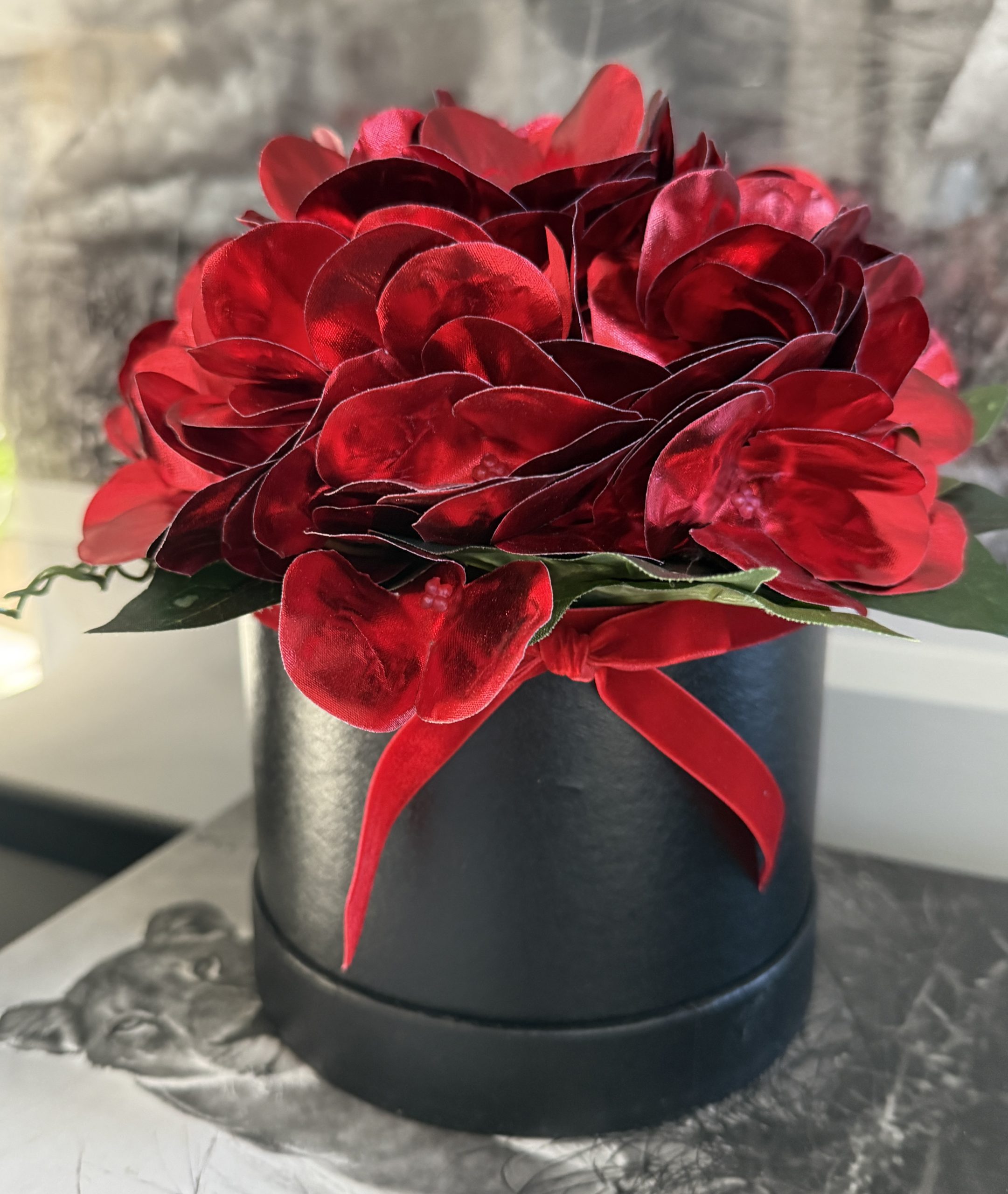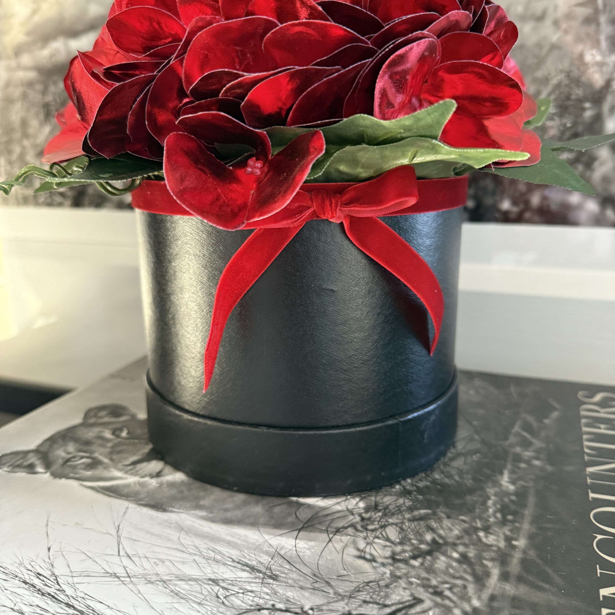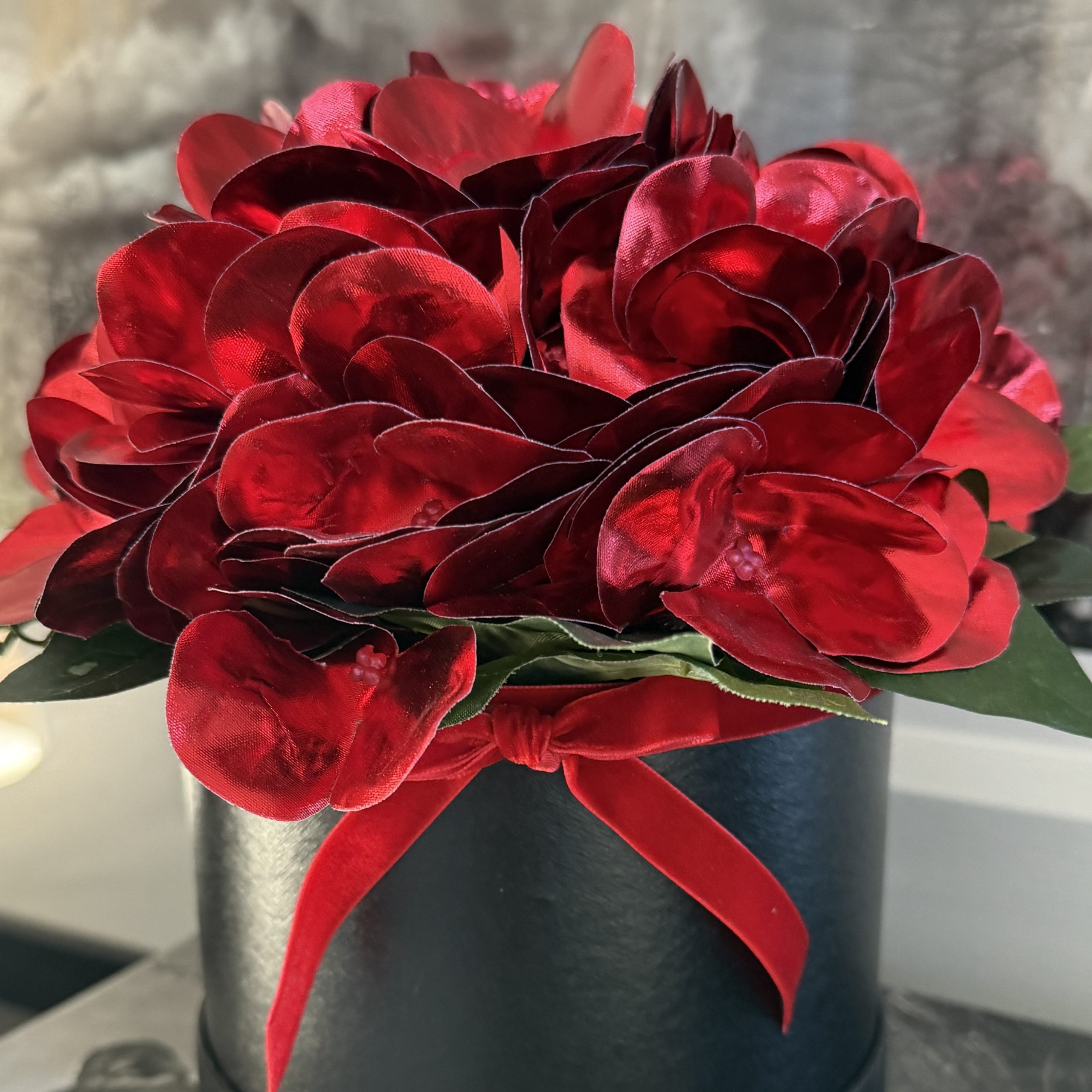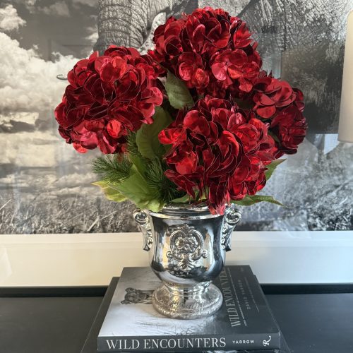 This striking artificial flower arrangement is ideal for adding a special touch to any room. Quality red ‘metallic’ hydrangeas are designed in a black hat box with a red velvet bow.