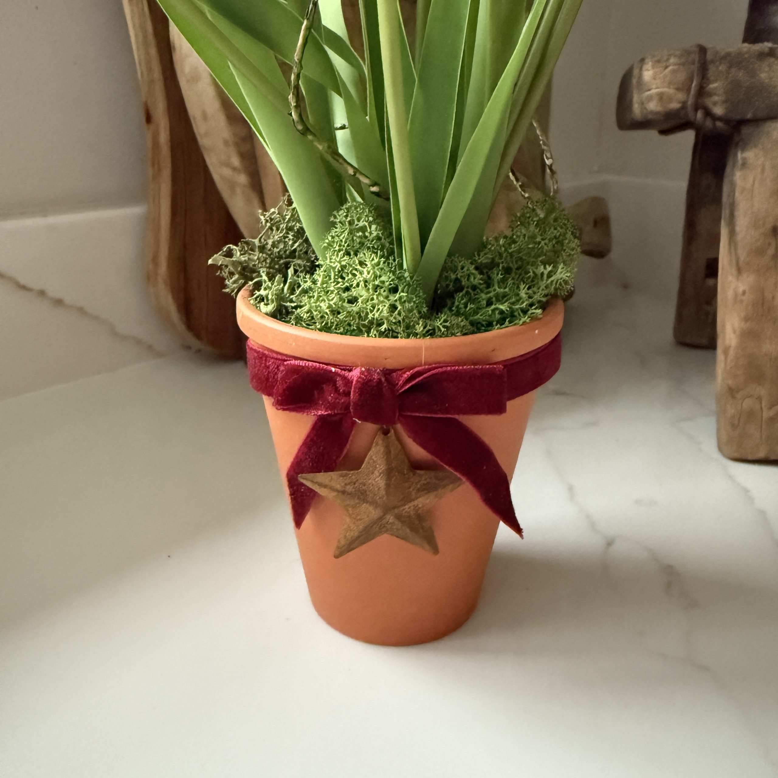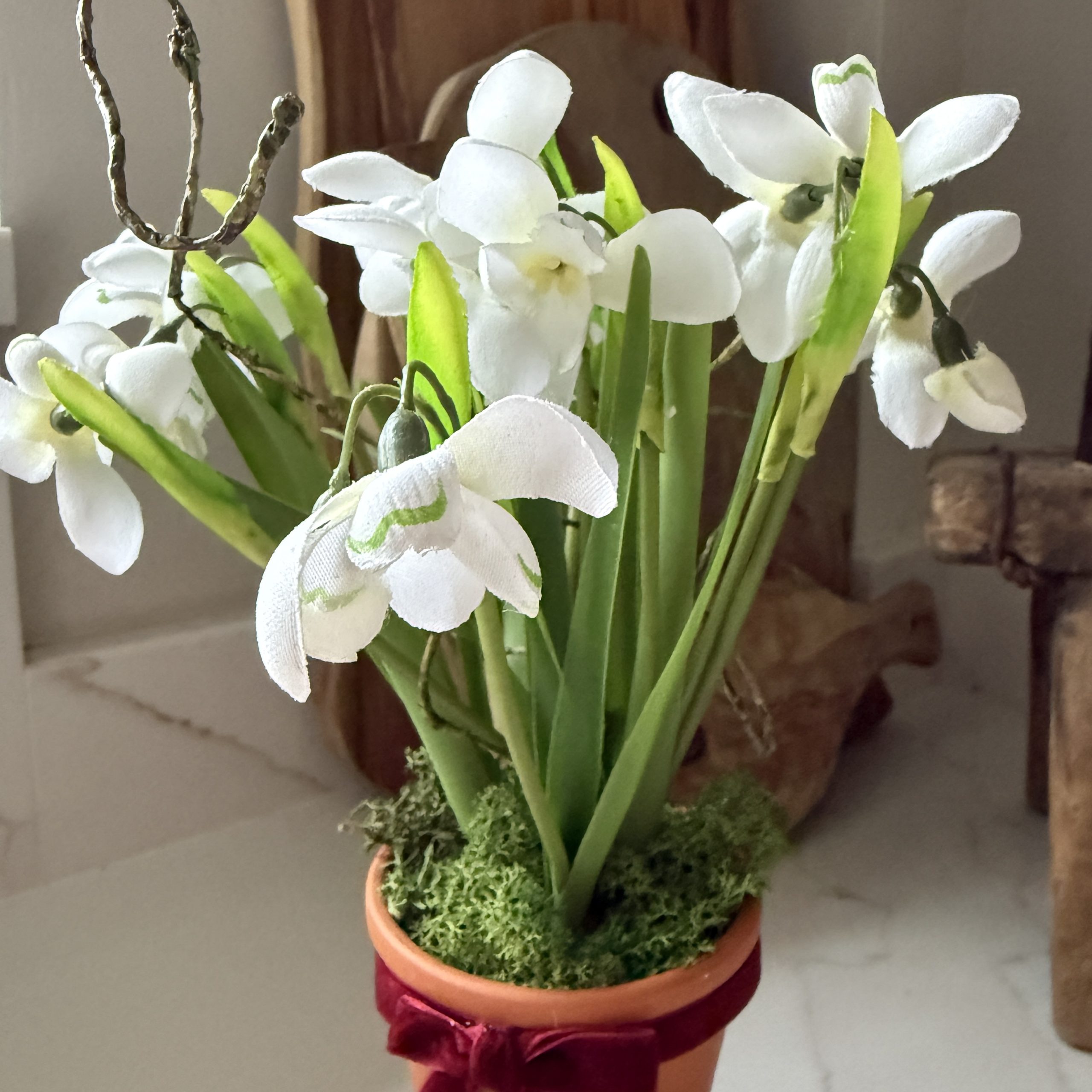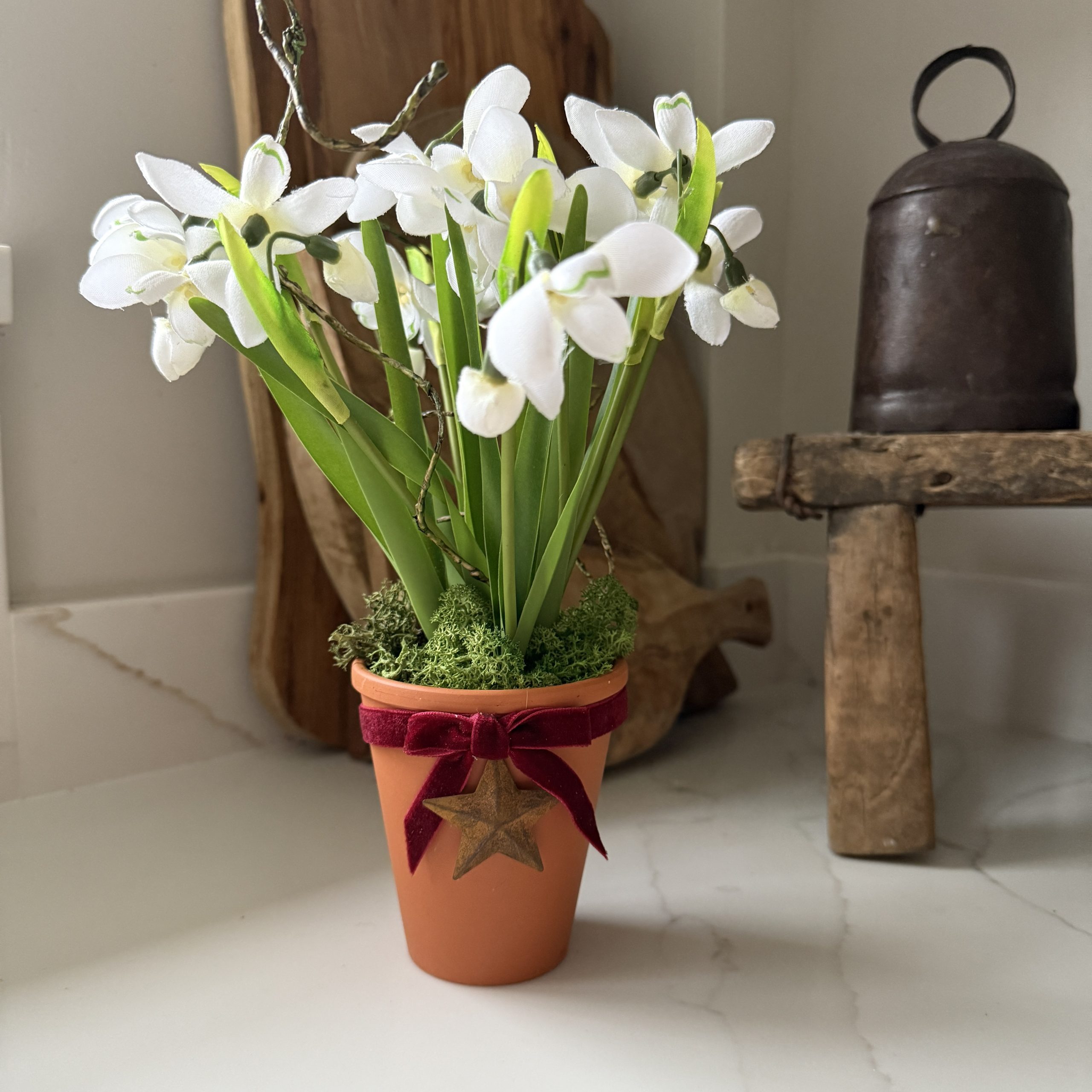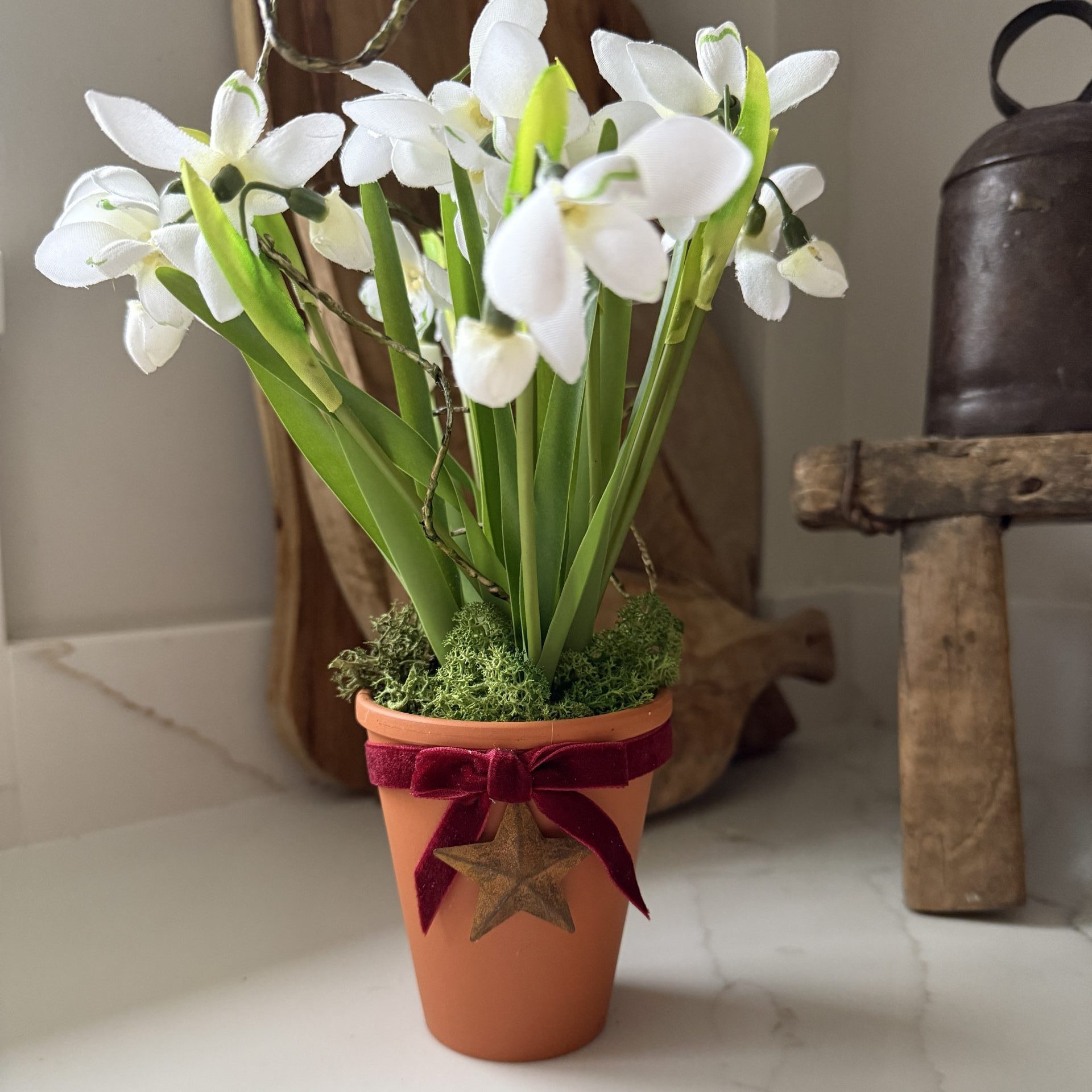 This very pretty artificial snowdrop silk flower arrangement is ideal for adding a special touch to any room. Quality and realistic these pretty little flowers are designed in a terracotta planter / vase with a burgundy velvet bow and rustic metal star.