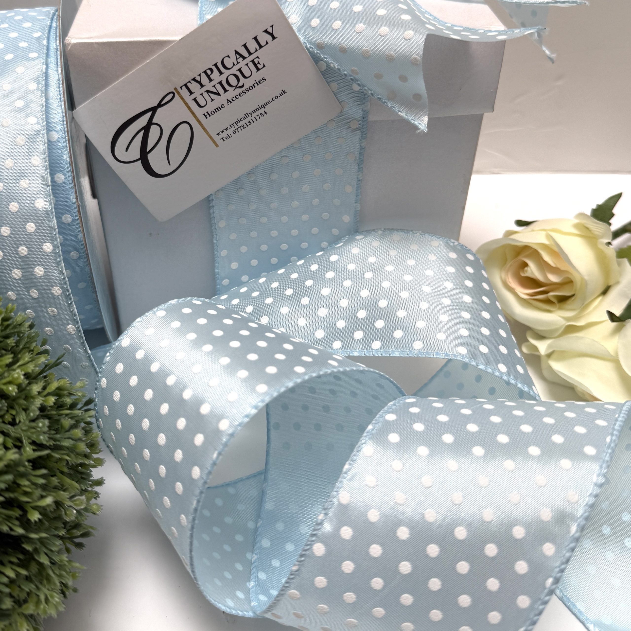 Be the first to review “Pale Blue Wire Edged Ribbon with White Polka Dot Design ‘Dee’”
