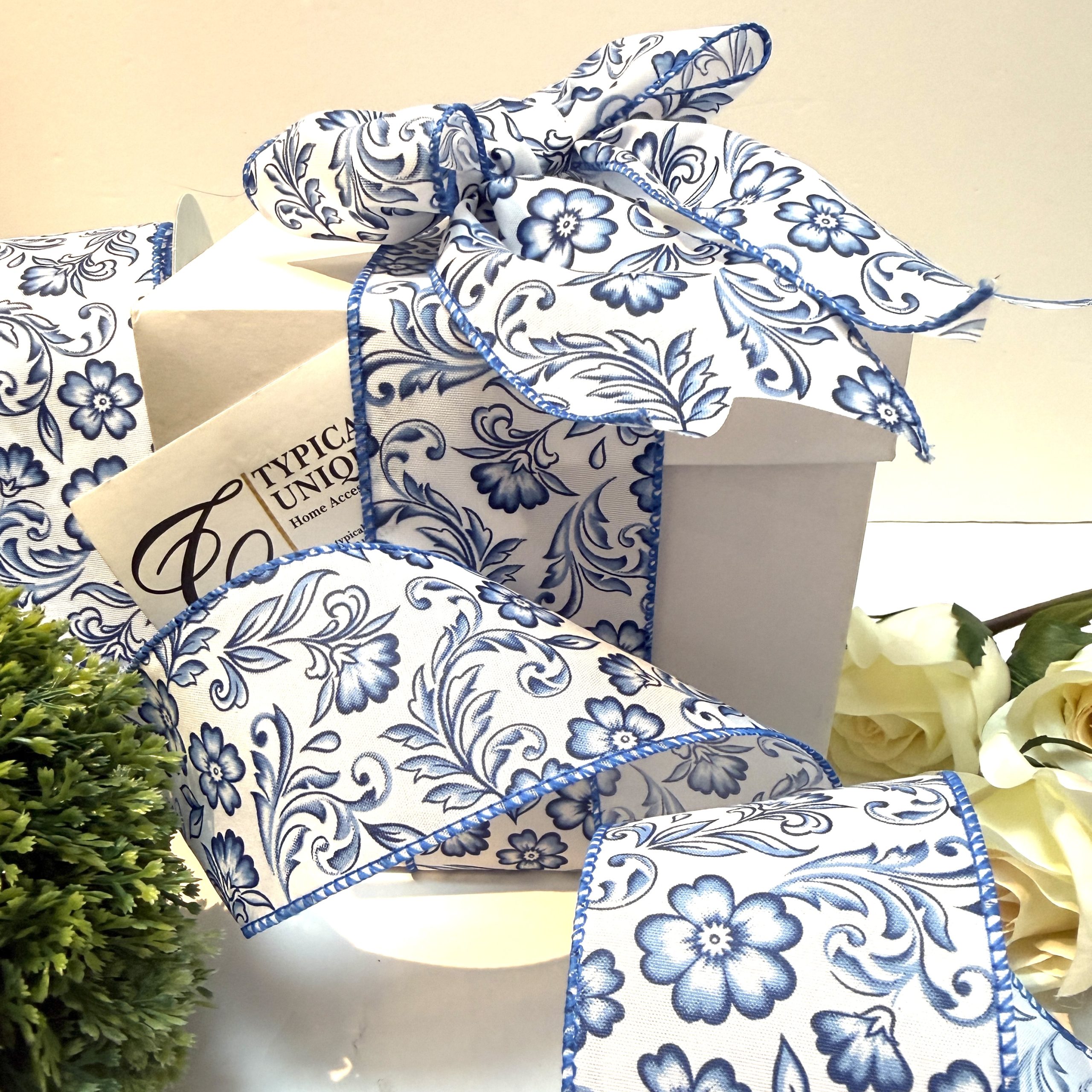 Wire Edged Blue and White Floral Ribbon ‘Bonnie’
